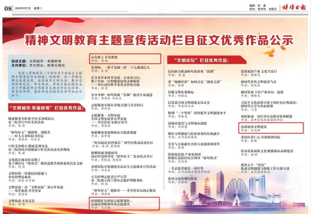 5月7日,由市文明辦、蚌埠日?qǐng)?bào)社聯(lián)合主辦的精神文明教育主題宣傳征文活動(dòng)結(jié)果揭曉,蚌固路公司職工劉志剛的征文作品《淺談精神文明建設(shè)》、王義鵬的征文作品《蚌固路紅色驛站志愿服務(wù)隊(duì):弘揚(yáng)雷鋒精神傳承志愿薪火》和路橋公司職工周敏的征文作品《心在路上 不負(fù)夢(mèng)想》獲評(píng)優(yōu)秀作品。